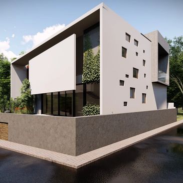 whole building mass is kept bulky and two double height skylight pockets contradicts its bulkiness from inside making internal spaces bright all through the day, a huge wall floats as main part of elevation in front.