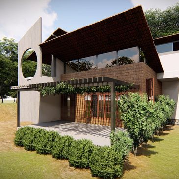 sculptural contemporary piece of art stands in middle of lush green areca farm in Ujire near Dharmastala. central courtyard, double height living room and a private garden adds to the spatial luxury of 6000 sq ft residence.